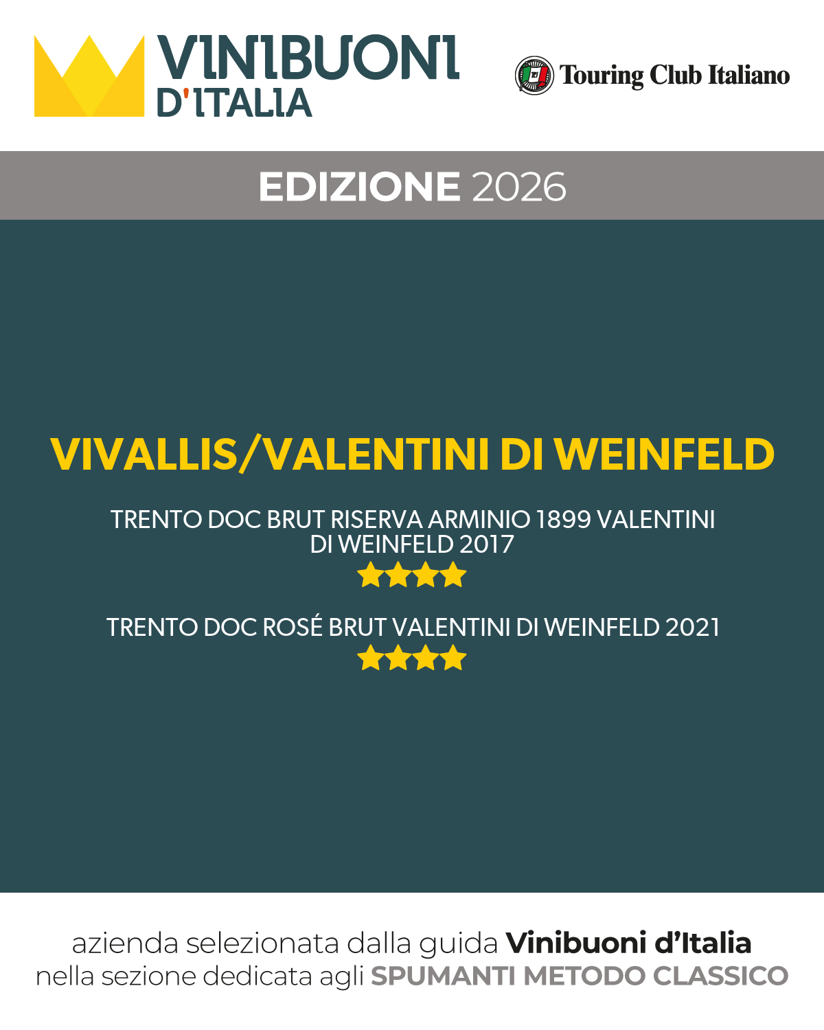 09 ottobre 2025 Valentini di Weinfeld Trentodoc Riserva Arminio 1899 2017 - 4 stelle Valentini di Weinfeld Trentodoc Brut Rosé 1899 2021 - 4 stelle